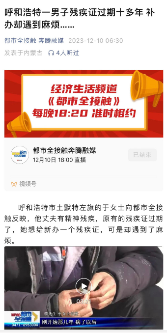 2023年12月10日,都市全接触一条“呼和浩特市一男子残疾证过期十年多,补办却遭遇麻烦”的新闻引起院党委及医院的关注。