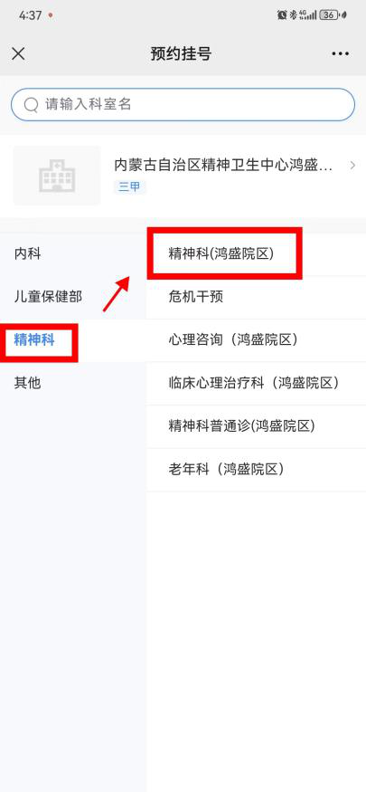 8、左侧导航栏点击“精神科”,在点击“精神科(鸿盛院区)”