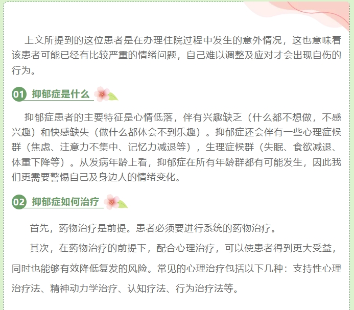 4月7日下午,鸿盛院区门诊患者趁家属办理住院手续期间,走到4楼行政办公区步梯间的窗户前,想要进行自伤行为。保安郭占前发现后立即安抚该患者情绪并同时上前制止,成功救下自伤患者。