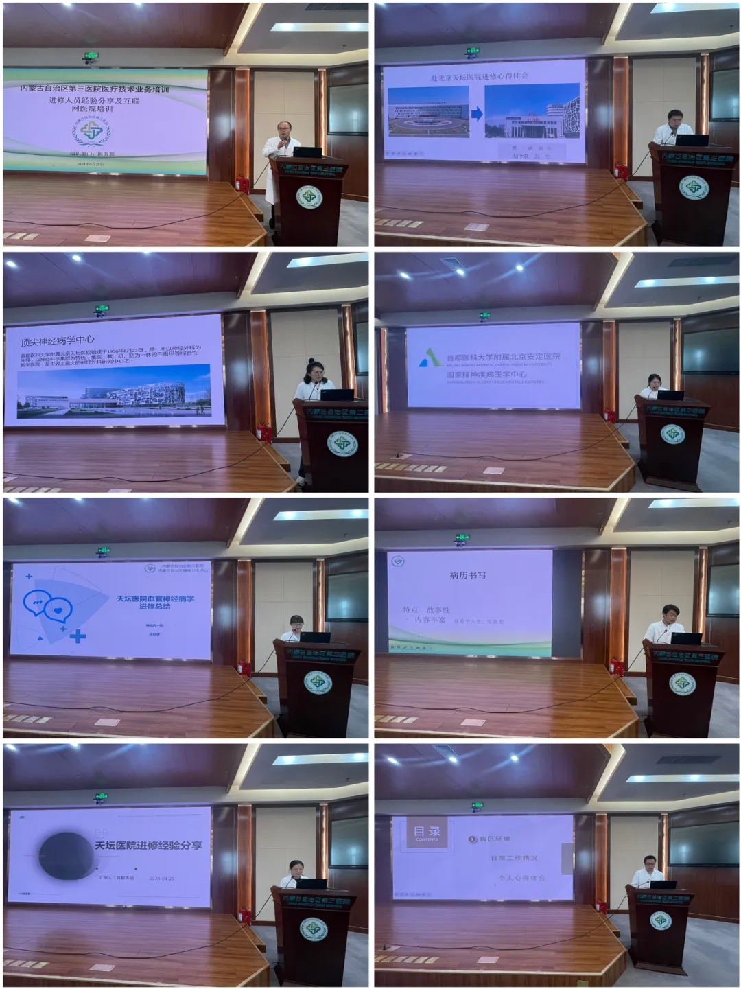 为交流分享学习经验和心得,促进人才培养,推动专科建设,2024年4月25日医务部组织了临床医生进修汇报分享会,全体临床医生参加了本次分享会。7名北京天坛医院及安定医院进修返回医师,结合自己的专业特点和学习方向,将自己在进修时的所见、所闻、所思、所想分享给大家。汇报医师们表示通过半年的进修学习不仅提高了业务水平也开阔了视野,进一步明确了自己的努力方向,要把学习到的先进技术与理念运用到今后的工作中,更好地服务患者,为医院的发展贡献自己的一份力量。