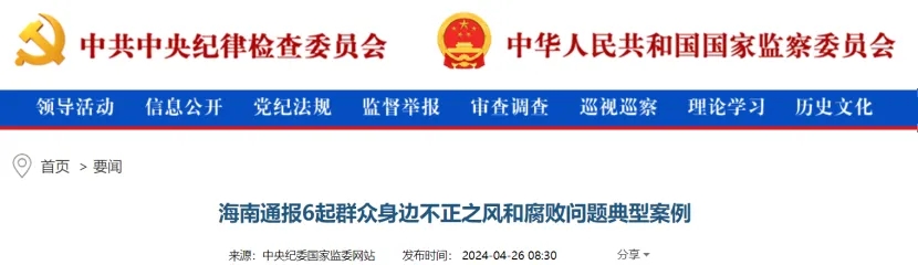 4月26日,中纪委官网发布《海南通报6起群众身边不正之风和腐败问题典型案例》。