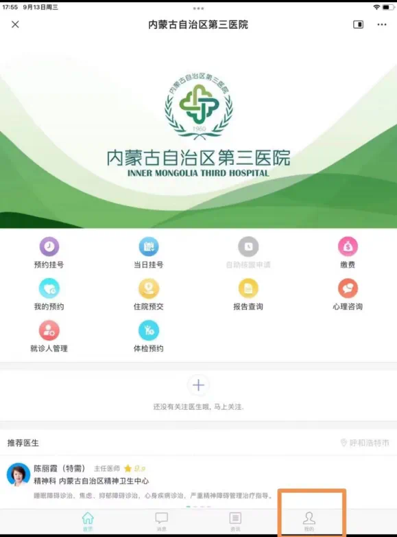 ”公众号,点击“预约挂号”,点击“我知道了”,选择“乌兰察布路院区”