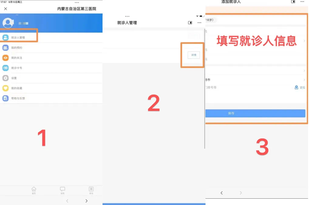4、点击“就诊人管理”→“详情”→ “完善个人信息”→保存