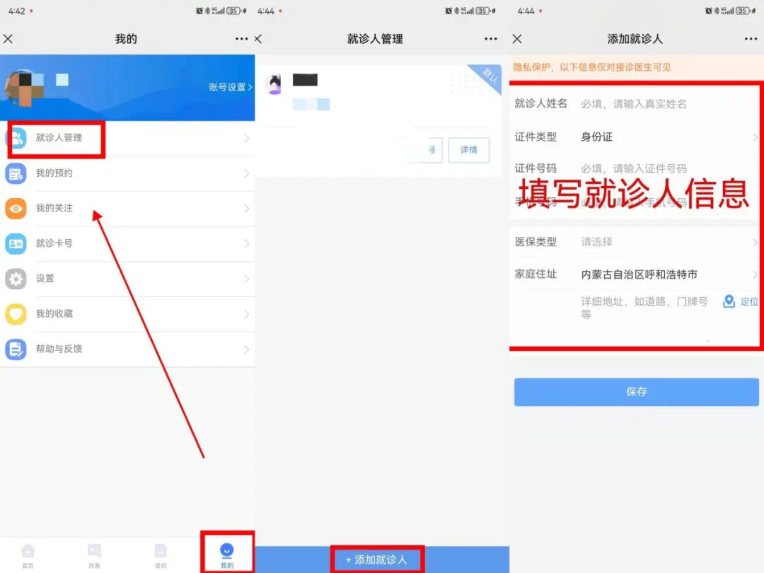 4、点击“就诊人管理”→“添加就诊人”→ “完善个人信息”→保存