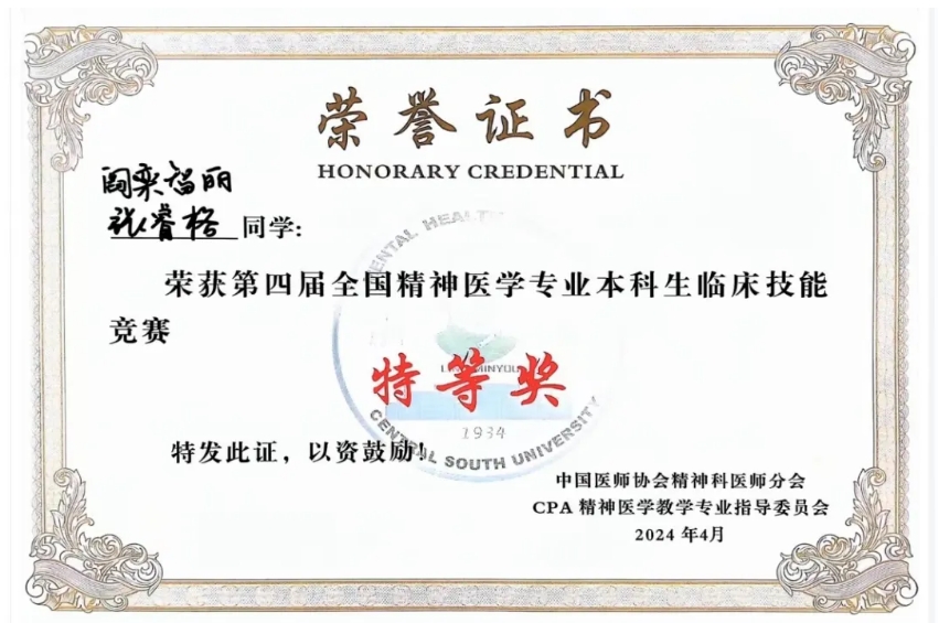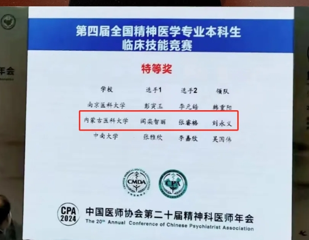 2024年4月25日-26日,由中国医师协会精神科医师协会(CPA)和CPA精神医学教学专业指导委员会主办,国家精神疾病医学中心(中南大学湘雅二医院)承办的第四届全国精神医学专业本科生临床技能竞赛在长沙市举行。本次竞赛旨在推动精神医学专业临床实践教学改革,创新实践教学体系,加强精神卫生专业医学生临床基础理论、基础知识、基本技能和人文关怀精神的培养,全面提升精神医学专业医学生综合素质和人才培养质量。经过两天激烈角逐由精神卫生学院2019级精神医学本科生阎栾智丽和2020级精神医学本科生张睿格组成的内蒙古医科大学代表队首次参赛荣获本次竞赛