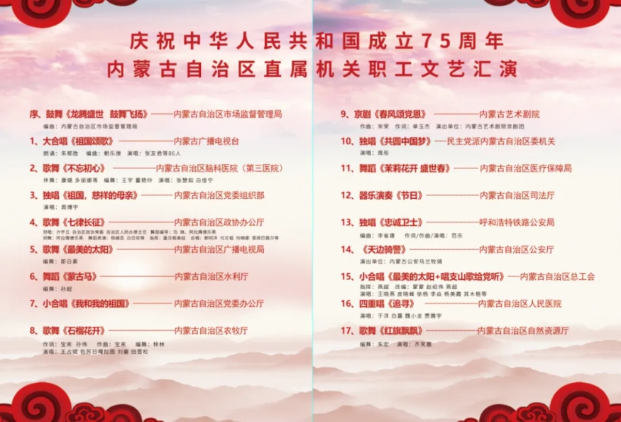 9月23日——24日,庆祝中华人民共和国成立75周年内蒙古自治区直属机关职工文艺汇演在内蒙古自治区文化馆举行。演出由内蒙古自治区直属机关工委、内蒙古广播电视台共同主办。肉漫屋