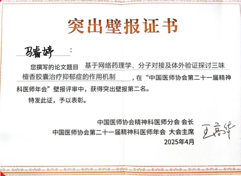 医学检验科主管药师马睿婷撰写的论文《基于网络药理学、分子对接及体外验证探讨三味檀香胶囊治疗抑郁症的作用机制》荣获大会论文评审第二名、壁报评审第二名。