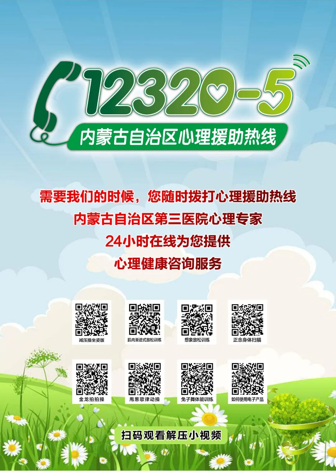 内蒙古自治区精神卫生项目办组织临床心理中心专家精心制作了心理援助海报,并第一时间发放到封控、管控小区(村),为大众提供心理援助热线12320-5,及自我心理减压技巧,畅通心理援助渠道,帮助大家有效缓解了焦虑、抑郁等不良情绪。
